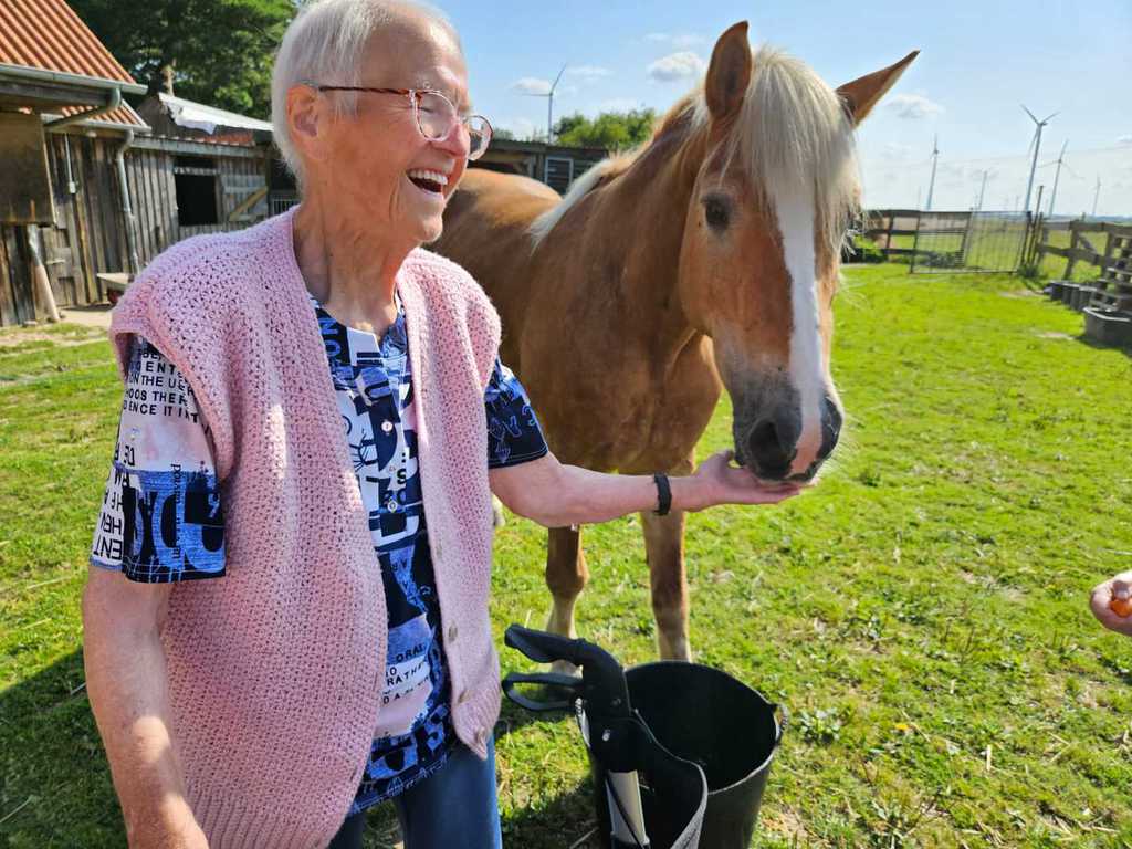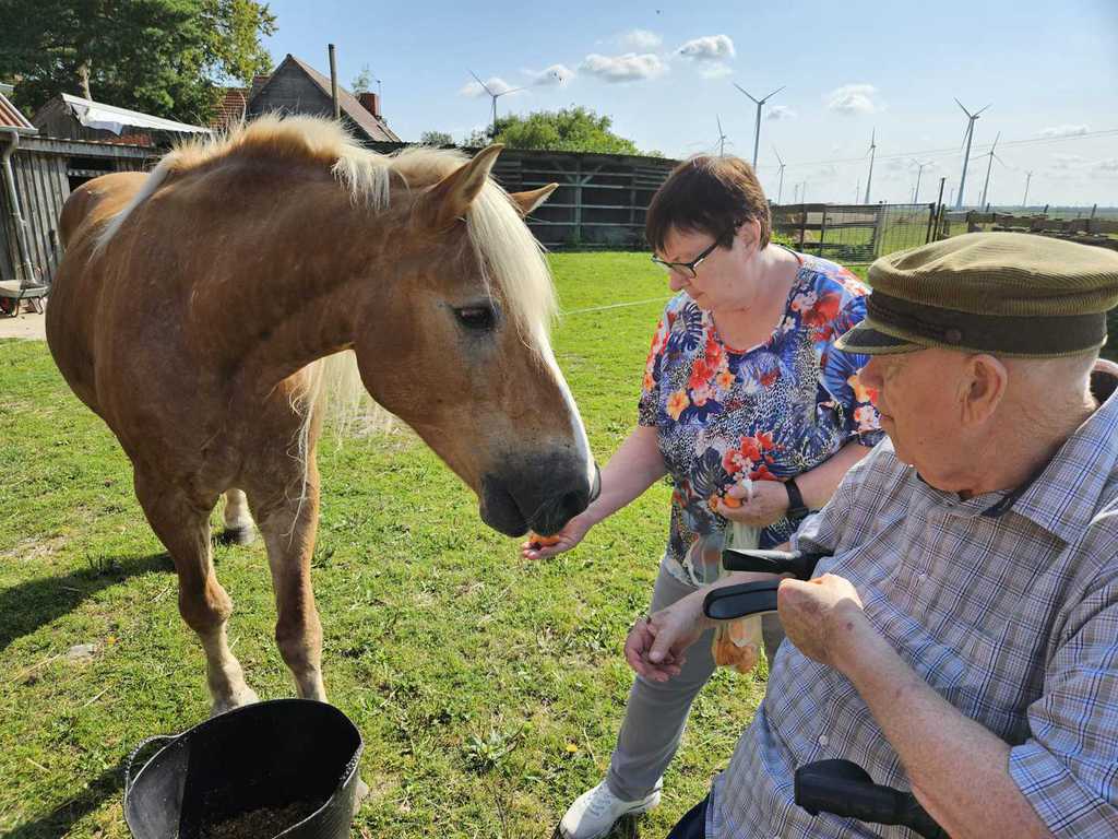 Tagesgäste des Deutschen Roten Kreuz waren mit Schwester Nicole und Schwester Anja bei uns zu Besuch und haben unsere tierischen Bewohner mit viel Zuneigung gestreichelt und gefüttert. Ob die flauschige Mähne der Pferde, die zutraulichen Esel oder die neugierigen Katzen u.a., für alle war etwas dabei. Für die Tiere gab es ordentliche Portionen an Äpfeln, Möhren und sonstige Leckerlies und für unsere Besucher selbstgebackenen Kuchen zu einem gemütlichen Kaffee.